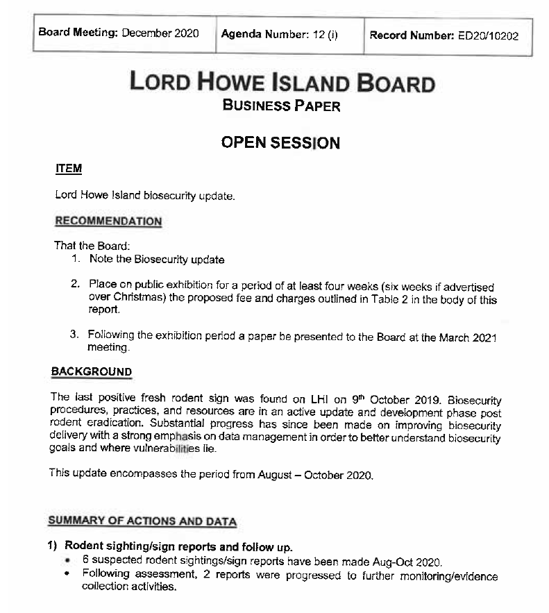 The Business Paper for the Lord Howe Island Board Meeting held in December 2020 (copy of page 1 attached) notes the following: