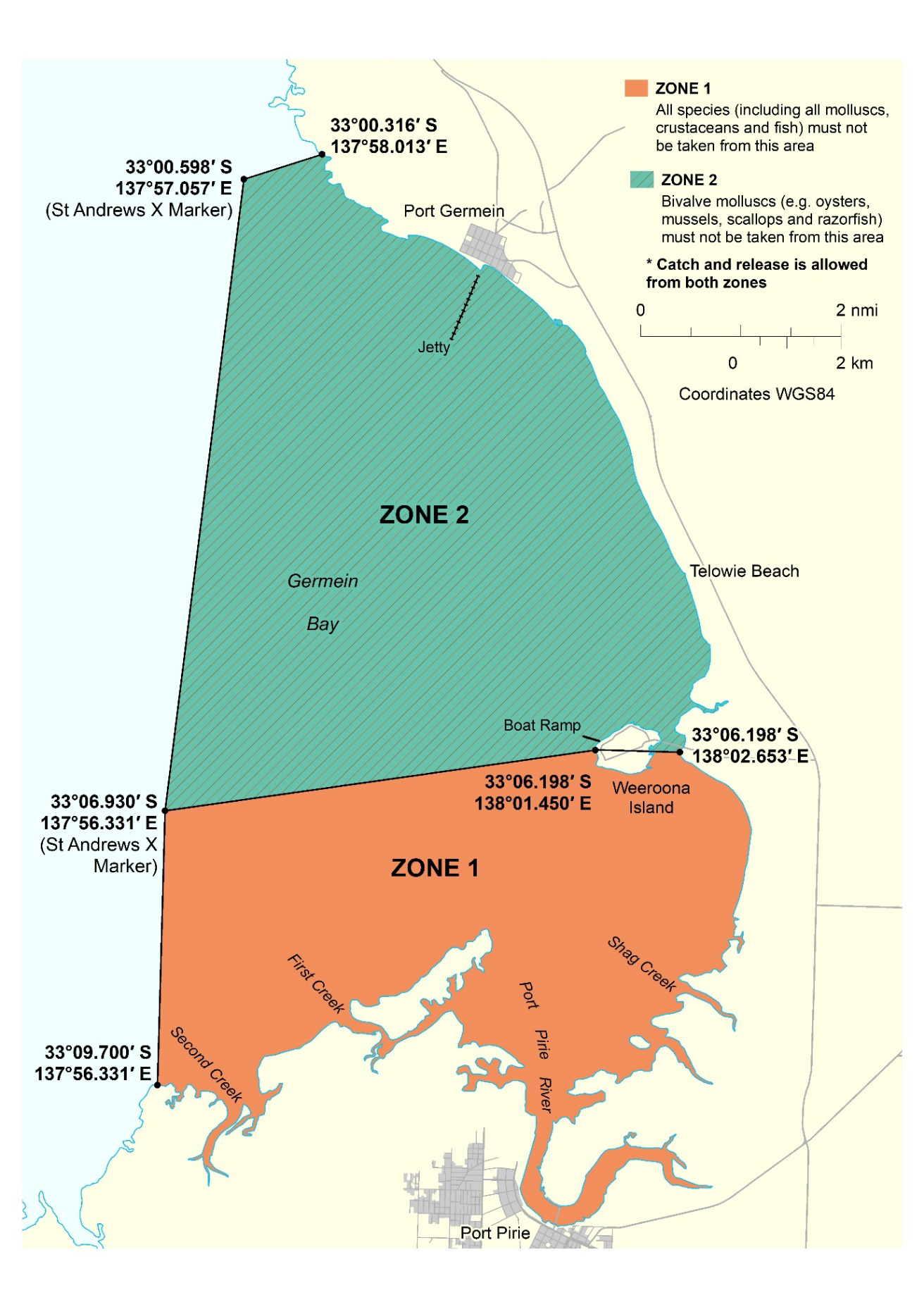 Zone 2 – waters in the Port Germein area, extending north and west from Weerona Island Boat Ramp.