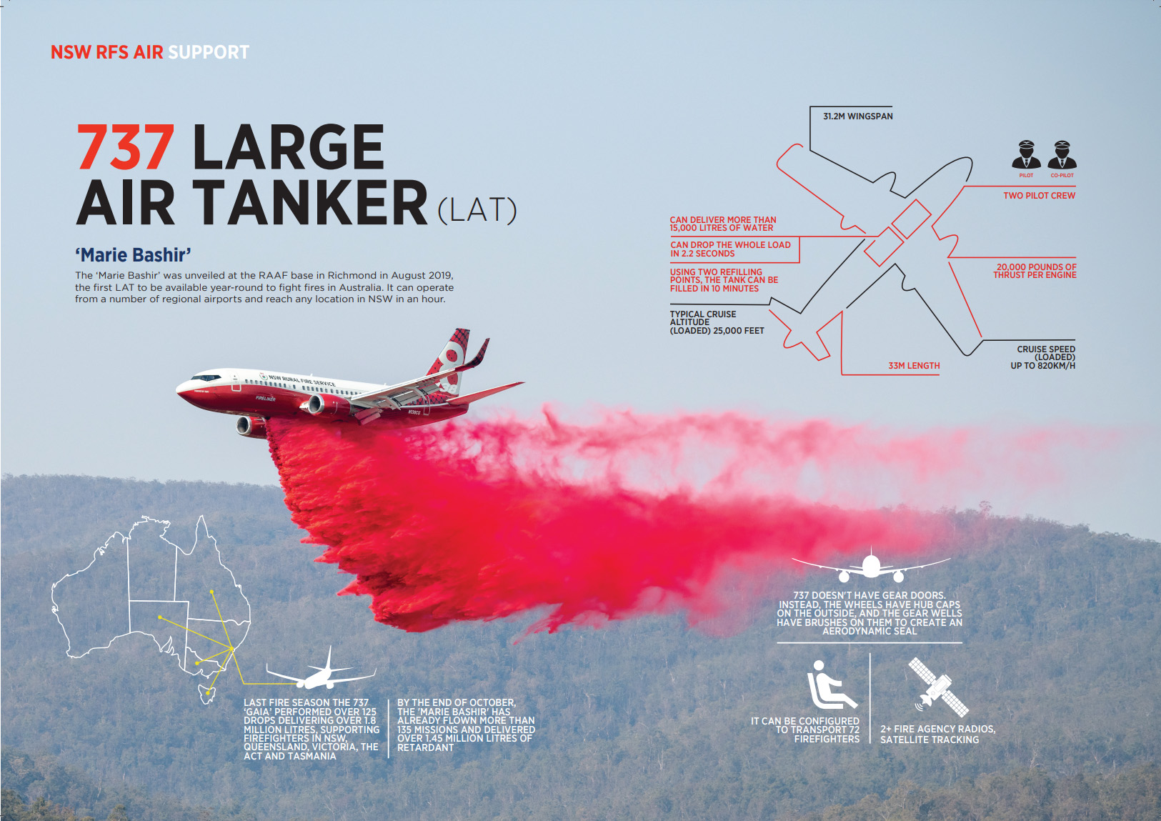 After spending two months assisting with wildfires burning in the northern hemisphere, the 737 Large Air Tanker (LAT), ‘Marie Bashir’, has returned to NSW, and will be ready to assist firefighters to save lives and properties here, as part of the RFS aerial fleet.