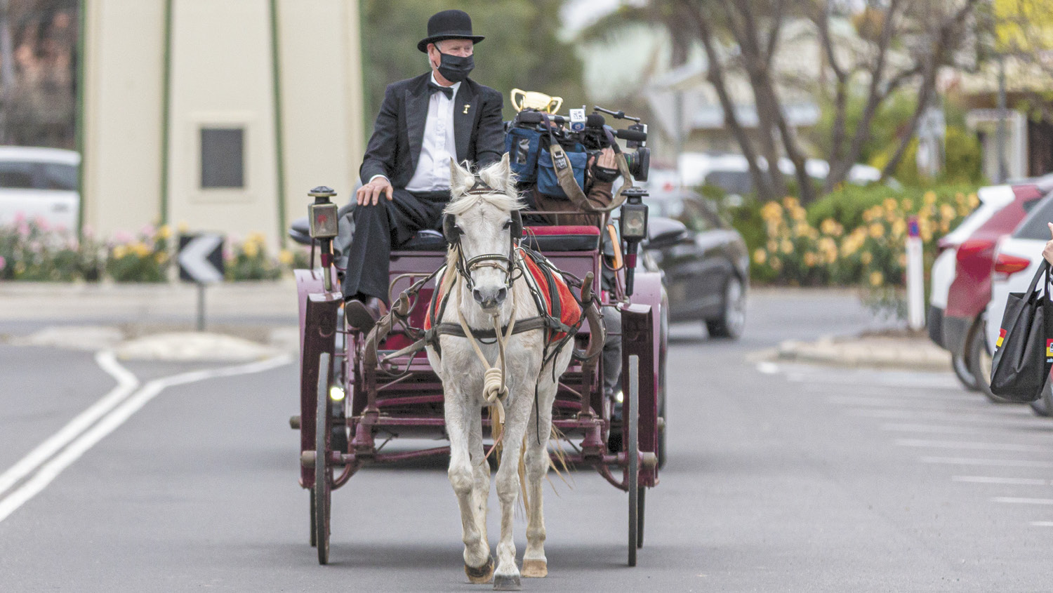 The cup toured Kerang most of the day and then headed for the ‘Wetlander’ near Koondrook in the late afternoon where Darryl and Michelle McNeil, on behalf of Jye, presented a framed print from his winning 2020 Melbourne Cup ride to the Kerang Turf Club.