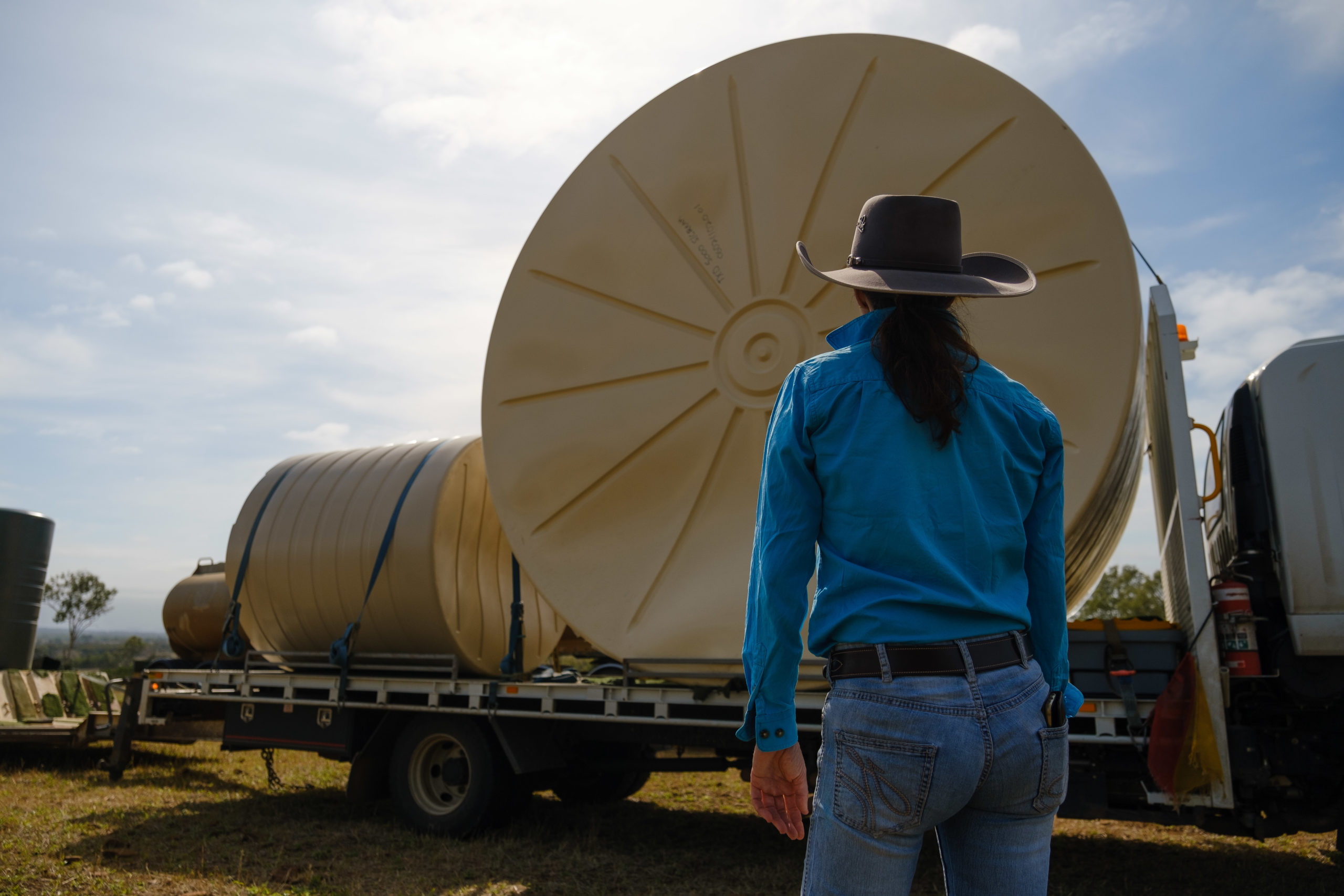 The first water tank delivery took place today in Dalma, west of Rockhampton, where farmer Julie Sheehan welcomed both a 22,500L water tank and water delivery to her property.