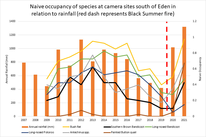 “While this is preliminary monitoring data, our cameras have been monitoring the same 40 locations in State forests south of Eden for more than a decade and this latest data is a really promising sign that many native species have not only survived the Black Summer fires quite well, but are currently thriving.”
