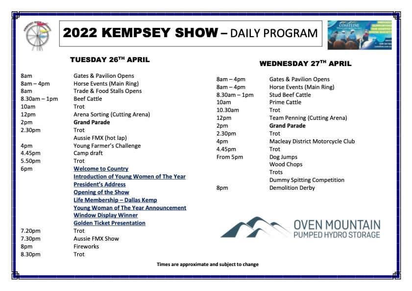 Keep up to date with us via social media @kempseyshow both on Facebook and Instagram additional please check out Kempsey Show website for all information http://www.kempseyshow.com.au