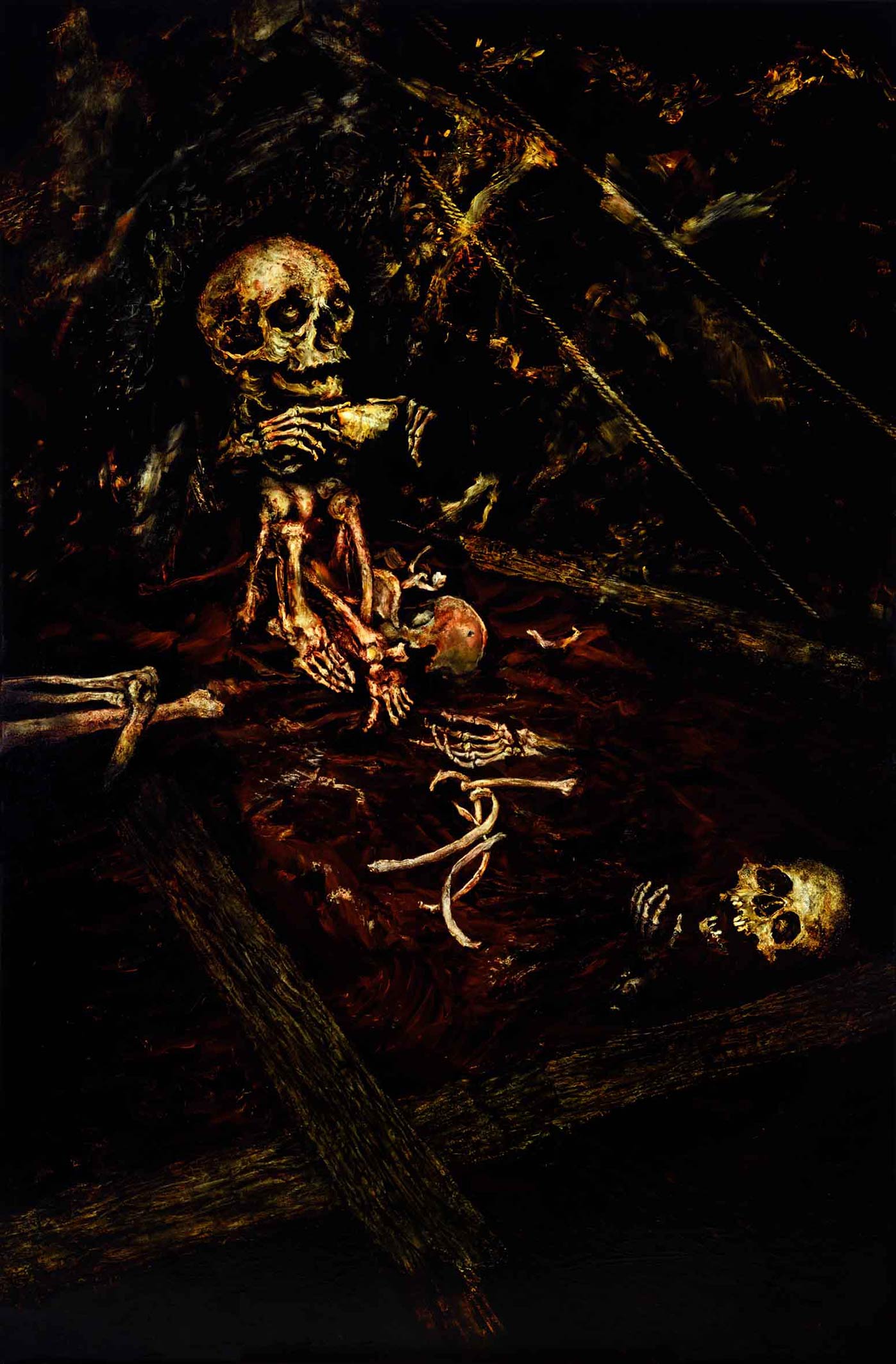 Terry wrote, ‘I have portrayed Louise as macabre human remains, sexually charged whilst clutching in her right hand the head of her lover. . . a blood stained skull (thy neighbour’s wife) which appears to hover in the darkness like a threatening beacon. Religious texts that cannot condone homosexuality are flippant in death because most people cannot tell the difference between the female and male skull.’