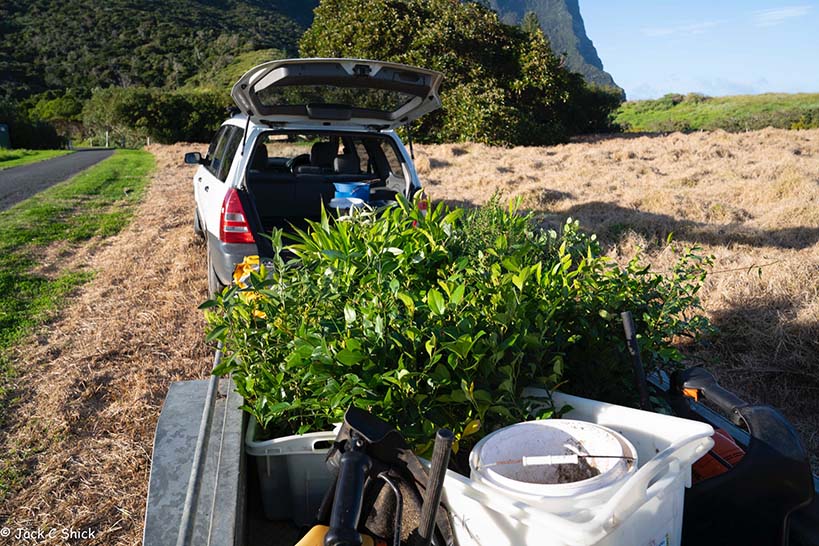 On this trip, the Friends again assisted the Lord Howe Island Board weed team with projects. One was a visit to Blackburn Island to plant out more small trees as part of the revegetation program there. They also assisted with the removal of the invasive creeper, Coastal morning glory, which grows over the top of the newly planted trees, smothering them and taking their light, nutrients and water. Middle Beach was the site of the other project. There in forest, during the in 2018-19 droughts, many Blackbutt trees died. The opening up of the forest canopy to more light, led to an invasion by weeds such as Palm grass and Cape gooseberry. On a number of recent trips, the Friends have worked to free this area of weeds.