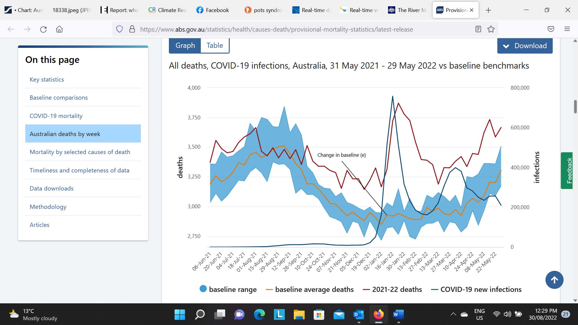 The Australian Bureau of Statistics has reported a surge in Aussies dying. In 2022, there were 75,593 deaths that occurred by May 31 and were registered by July 31, which is 10,757 (16.6 per cent) more than the historical average. May alone saw 16,124 deaths, 1,922 (13.5 per cent) above the historical average.