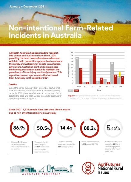The annual report prepared by AgHealth Australia, funded by AgriFutures Australia, Non-intentional Farm Related Incidents in Australia 2021, found that there were 46 on-farm deaths from 1 January to 31 December 2021, compared to 58 on-farm deaths in the same period for 2020.