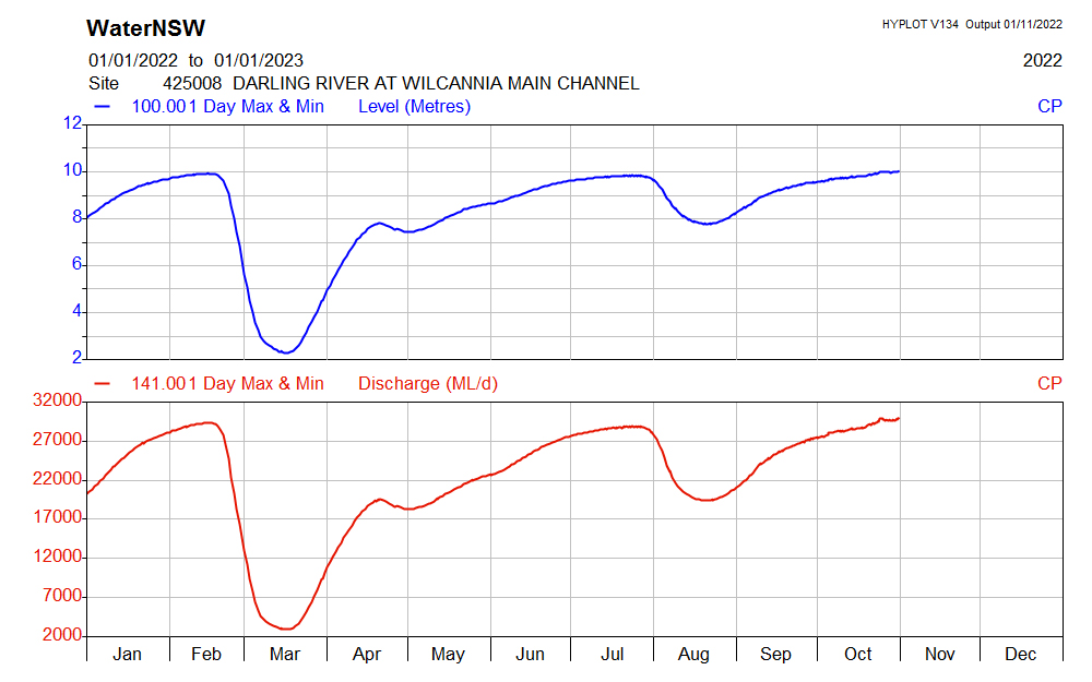 The river continues to rise at Wilcannia and is now running at just over 10 metres with a flow of 30,043 ML/day. Lake Woytchugga is continuing to fill and the Talyawalka is flowing at 6.7 metres.