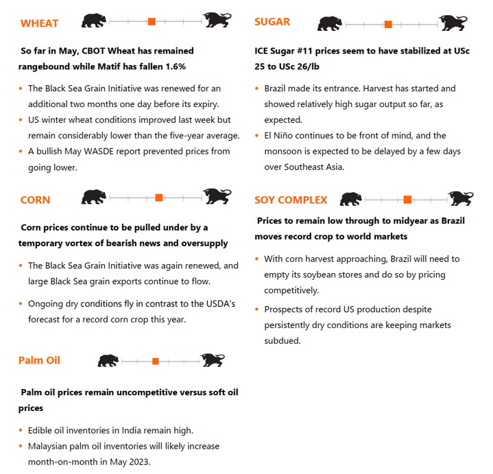 So far in May, the S&P GSCI Agriculture Index has declined a modest 0.6% amid the renewal of the Black Sea Grain Initiative (BSGI) and ample grain and oilseed supplies.