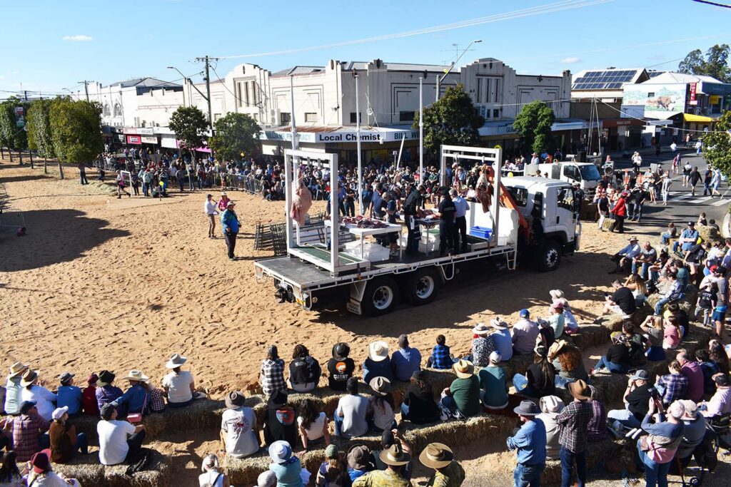 It was Beef Week Saturday, May 27, and the art of de-boning meat was a spectator sport. Crowds gathered around the truck, sitting on hay bales, as they watched the butchers cut, chop and use every part of the carcase to produce cuts of retail-ready meat.