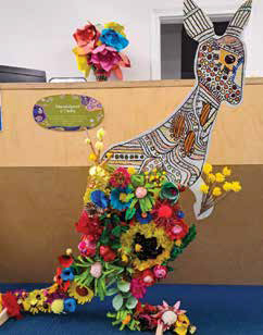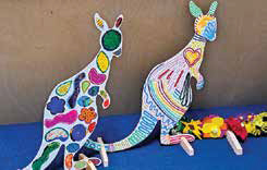 Students decorated three kangaroos using a variety of mediums. Students in all grades contributed to the kangaroo artwork. Grade 4/5/6 students worked on the larger kangaroo.