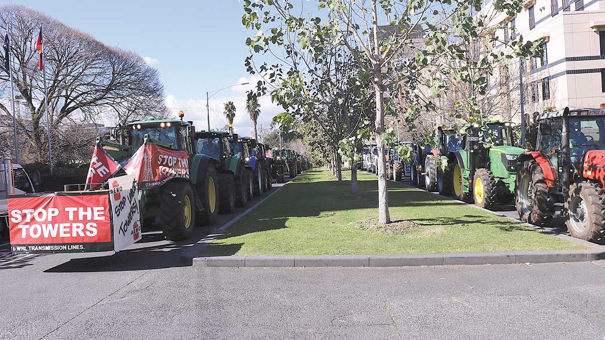 An estimated 45 tractors, 10 prime movers and about 20 utilities brought commuters to a standstill as part of a ‘Stop the Towers’ rally, taking aim at Australian Energy Market Operator’s plan to carving up properties with 100m wide easements to install 70-80m power towers carrying 500kV interstate transmission lines.