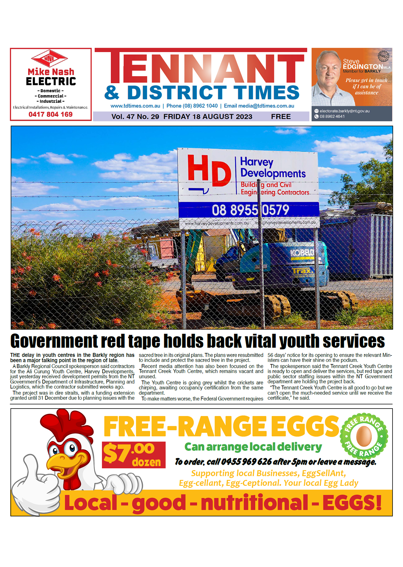 NewsNTOut now - Archive - August 2023 Tennant & District Times, 18 August 2023 By Tash Adams, Tennant & District Times 18 August 2023 Recent stories Opening smarter pathways to cut landfill emissions and earn ACCU revenue: Wilson Contributor, ARR.News - Light Horse skills not lost Mark Collins, Corryong Courier - Environmental surveys continue Contributor, The Buloke Times - Farmers’ rights eroded Contributor, The Buloke Times - Fuel crisis hits hard Narrandera Argus - Ramsay local to captain Queensland Polocrosse team Ted Rogers, On Our Selection News - Getting fertiliser to farmers faster: Collins Contributor, ARR.News - $3 million boost drives groundbreaking koala research in Port Stephens: Watt, Swanson Contributor, ARR.News - Whales are making an appearance Coast Community News - Cohuna turns out for barefoot titles opener Contributor, The Koondrook and Barham Bridge Newspaper - Farmer left bone dry after fuel theft Contributor, The Koondrook and Barham Bridge Newspaper - LambEx26 program launch Contributor, ARR.News - Radical Right v Radical Left and the threat of the Age of Unreason Kookaburra, ARR.News - Renewed effort to supercharge faba bean breeding and expansion: GRDC Contributor, ARR.News - Elders bales on WA wool growers – Just the tip of the iceberg: Geoff Pearson WAFarmers Contributor, ARR.News - Load more Tash Adams, Tennant & District Timeshttps://www.tdtimes.com.au/ Out now! Please leave this field emptyKEEP IN TOUCH Sign up for updates from Australian Rural & Regional News Manage your subscription We don’t spam! Read our privacy policy for more info. Thank you for subscribing for updates from Australian Rural & Regional News! By default you will receive all our newsletters. If you'd prefer to choose which newsletters you receive, go to the manage your subscription page make your selection. I'd love to hear from you if you have any feedback on the newsletter or the news platform or the news itself. Best Wishes, Fiona Fox The Editor Share FacebookLinkedinXPinterestWhatsAppEmailReddIt Previous articleTarrangower Times, 18 August 2023Next articleThe Buloke Times, 18 August 2023 For all the news from the Tennant & District Times, go to https://www.tdtimes.com.au/ Out Now! Corryong Courier, 16 April 2026 Mark Collins, Corryong Courier - Narrandera Argus, 16 April 2026 Narrandera Argus - On Our Selection News, 16 April 2026 Ted Rogers, On Our Selection News - The Buloke Times, 16 April 2026 The Buloke Times - Coast Community News, 16 April 2026 Coast Community News - The Koondrook and Barham Bridge Newspaper, 16 April 2026 Lloyd Polkinghorne, The Koondrook and Barham Bridge Newspaper - Allora Advertiser, 15 April 2026 Mim Rogers, Allora Advertiser - Murray Pioneer, 15 April 2026 Murray Pioneer - See all Latest stories from the Tennant & District Times on ARR.News Early voting begins for NT election Tash Adams, Tennant & District Times - 16 August 2024 Desert Harmony Festival: A weekend of festivities and music Tash Adams, Tennant & District Times - 9 August 2024 Remembering Elliot McAdam: Local leader honoured for service to Barkly Tash Adams, Tennant & District Times - 9 August 2024 Services collaborate to address community legal needs in Barkly Tash Adams, Tennant & District Times - 9 August 2024 Writ issued: Countdown on for NT election Tash Adams, Tennant & District Times - 2 August 2024 New homes ready for tenants, tender awarded for 6 more Tash Adams, Tennant & District Times - 2 August 2024 New social and affordable homes for Tennant Creek Tash Adams, Tennant & District Times - 26 July 2024 Culturally significant objects returned home to Warumungu country Tash Adams, Tennant & District Times - 26 July 2024 Load more
