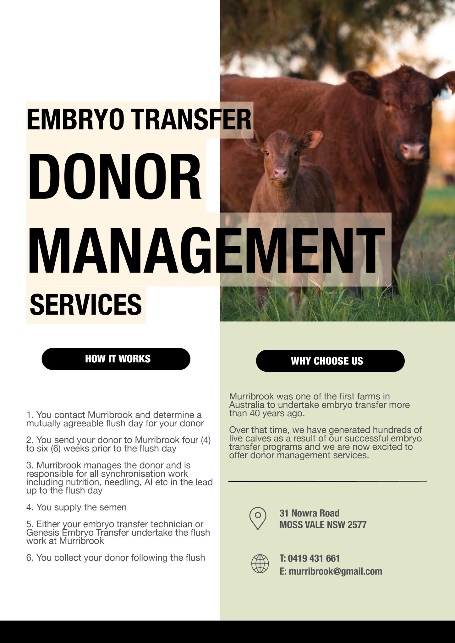 Having operated the highly successful Murribrook Holsteins stud dairy herd, producing hundreds of live calves through successful embryo transfer programs, we are now excited to offer our decades of knowledge and experience in embryo transfer to the Australian cattle industry.