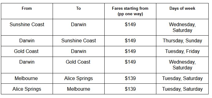 Flights are on sale with the Sunny Coast-Darwin route priced from $149pp (one way) starting on 29 November; Gold Coast-Darwin also priced from $149pp (one way) starting on 1 December and Melbourne-Alice Springs starting from $139pp (one way) commencing on 12 December.