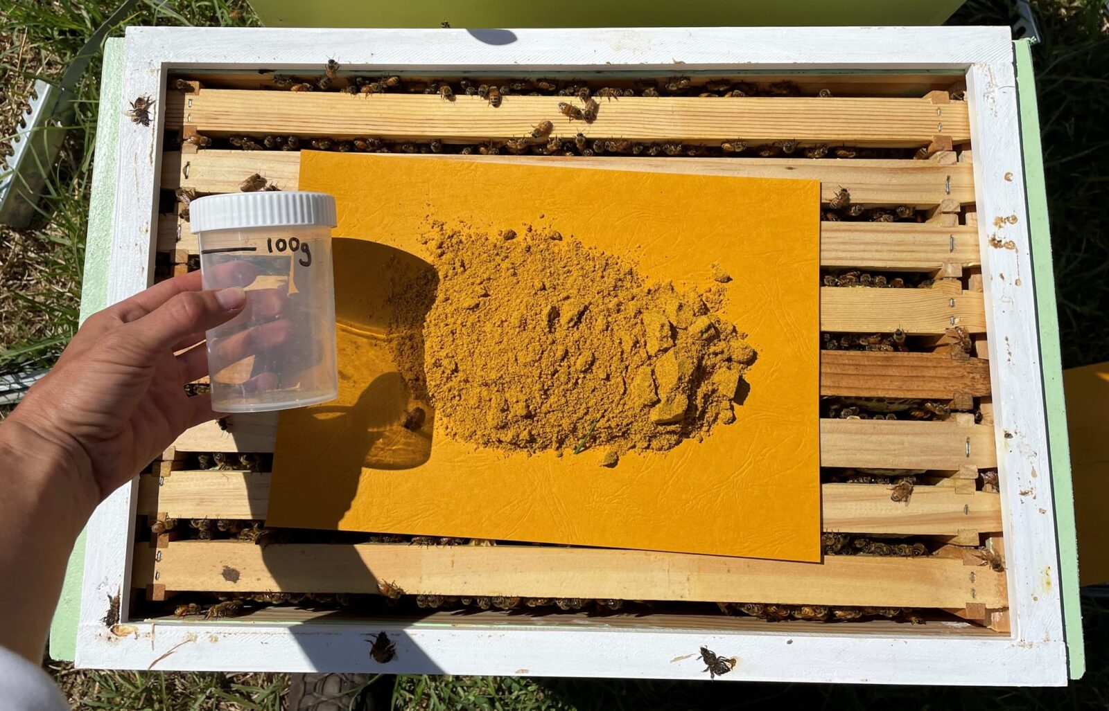 “And all our hives are fed individually with top sugar feeders, so we know exactly how much each hive is being fed from our different treatment groups and we can measure how much feed each hive consumes.