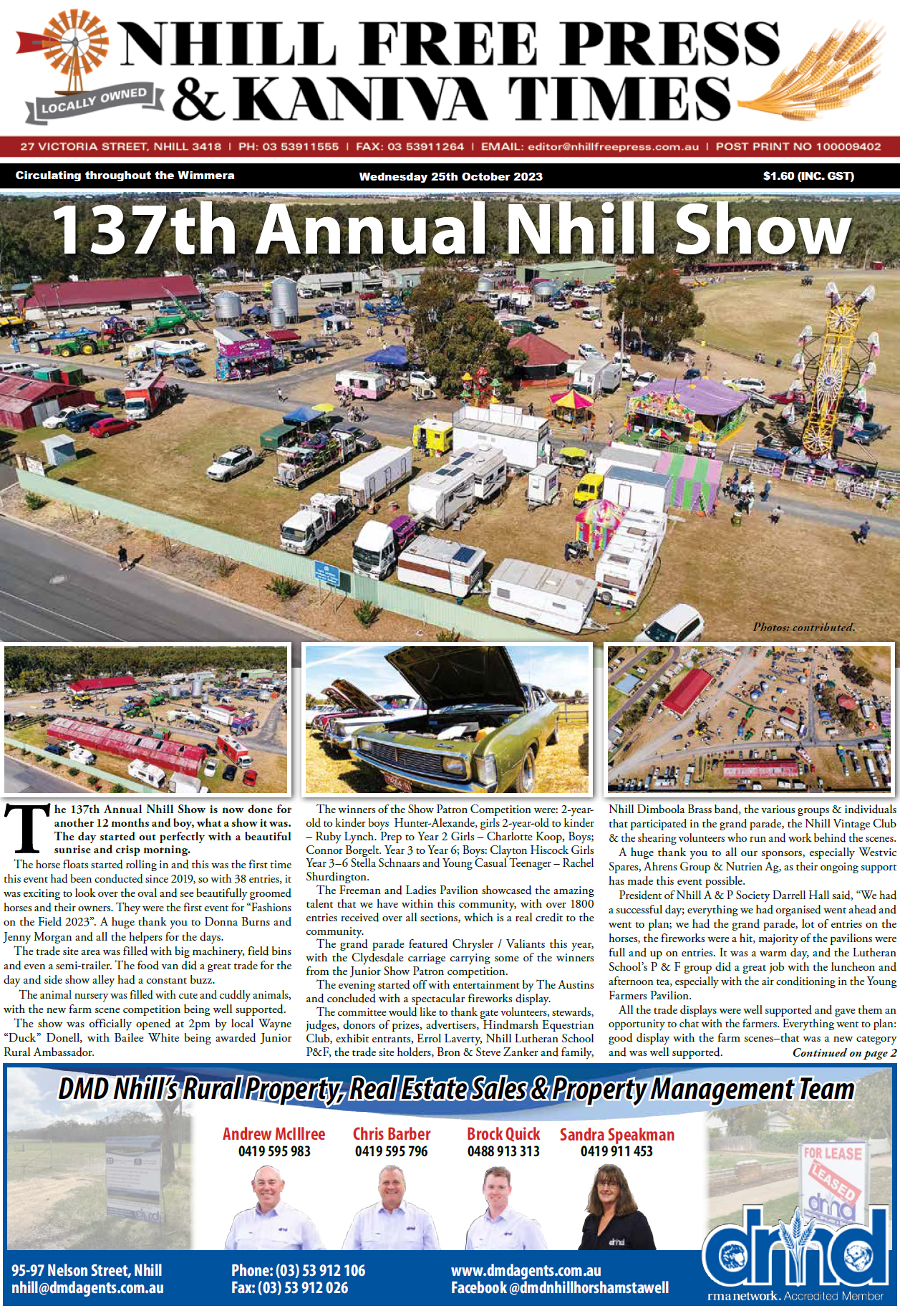 NewsOut now - Archive - October 2023Vic Nhill Free Press & Kaniva Times, 25 October 2023 By Emily Gladdis, Nhill Free Press & Kaniva Times 25 October 2023 Recent stories Fertiliser shortage at home, subsidies for exports abroad Trevor Whittington, CEO WAFarmers - Council is running effectively – OLG Rodney Stevens, Clarence Valley Independent - Newstead medical physicist grateful to help community Contributor, Tarrangower Times - Old wool table now looks classy Mim Rogers, Allora Advertiser - New Australia-United Kingdom MOU to unlock more investment: Chalmers, Reeves Contributor, ARR.News - Country Cabinet to continue under re-elected Malinauskas Government: Malinauskas Contributor, ARR.News - Public artwork commission to celebrate Loddon riverbanks Contributor, ARR.News - Don’t risk a bite to the hand that feeds Contributor, ARR.News - Watch My Cousin Frank on SBS On Demand: NORPA Contributor, ARR.News - Welcoming Hurford Hardwood as a NORPA Partner: NORPA Contributor, ARR.News - Killing koalas with kindness: Vic Jurskis Vic Jurskis - Opening smarter pathways to cut landfill emissions and earn ACCU revenue: Wilson Contributor, ARR.News - Light Horse skills not lost Mark Collins, Corryong Courier - Environmental surveys continue Contributor, The Buloke Times - Farmers’ rights eroded Contributor, The Buloke Times - Load more Emily Gladdis, Nhill Free Press & Kaniva Timeshttps://www.nhillfreepress.com.au Out now! Please leave this field emptyKEEP IN TOUCH Sign up for updates from Australian Rural & Regional News Manage your subscription We don’t spam! Read our privacy policy for more info. Thank you for subscribing for updates from Australian Rural & Regional News! By default you will receive all our newsletters. If you'd prefer to choose which newsletters you receive, go to the manage your subscription page make your selection. I'd love to hear from you if you have any feedback on the newsletter or the news platform or the news itself. Best Wishes, Fiona Fox The Editor Share FacebookLinkedinXPinterestWhatsAppEmailReddIt Previous articleNaracoorte Community News, 25 October 2023Next articleAllora Advertiser, 25 October 2023 For all the news from Nhill Free Press & Kaniva Times, go to https://www.nhillfreepress.com.au Out Now! Tarrangower Times, 17 April 2026 Tarrangower Times - Clarence Valley Independent, 17 April 2026 Clarence Valley Independent - Corryong Courier, 16 April 2026 Mark Collins, Corryong Courier - Narrandera Argus, 16 April 2026 Narrandera Argus - On Our Selection News, 16 April 2026 Ted Rogers, On Our Selection News - The Buloke Times, 16 April 2026 The Buloke Times - Coast Community News, 16 April 2026 Coast Community News - The Koondrook and Barham Bridge Newspaper, 16 April 2026 Lloyd Polkinghorne, The Koondrook and Barham Bridge Newspaper - See all Latest stories from Nhill Free Press & Kaniva Times on ARR.News Grandstand opening Emily Gladdis, Nhill Free Press & Kaniva Times - 15 April 2026 Ava’s fight highlights value of Good Friday Appeal Emily Gladdis, Nhill Free Press & Kaniva Times - 8 April 2026 Harmony Day Emily Gladdis, Nhill Free Press & Kaniva Times - 1 April 2026 From lockdown hobby to gallery walls Emily Gladdis, Nhill Free Press & Kaniva Times - 25 March 2026 Warriors clinch title Emily Gladdis, Nhill Free Press & Kaniva Times - 18 March 2026 Gallery Central featured artist: Peter’s pottery Emily Gladdis, Nhill Free Press & Kaniva Times - 11 March 2026 Fastest Wiener in the West to win $200 at Day of the Dackel 2026 Emily Gladdis, Nhill Free Press & Kaniva Times - 4 March 2026 Nhill’s forgotten hotel Emily Gladdis, Nhill Free Press & Kaniva Times - 25 February 2026 Load more