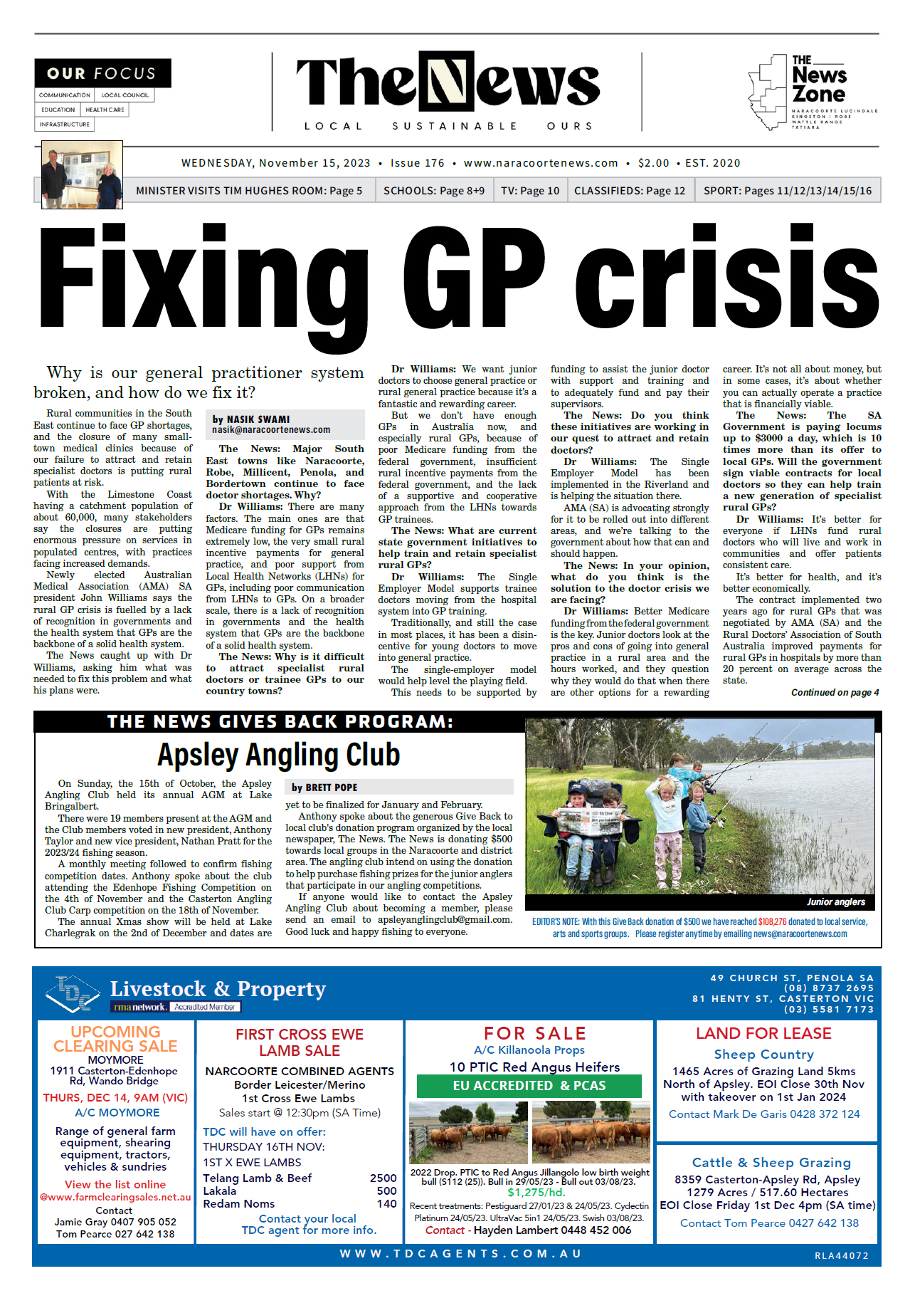 NewsOut now - Archive - November 2023SA Naracoorte Community News, 15 November 2023 By Michael Waite, Naracoorte Community News 15 November 2023 Recent stories Fertiliser shortage at home, subsidies for exports abroad Trevor Whittington, CEO WAFarmers - Council is running effectively – OLG Rodney Stevens, Clarence Valley Independent - Newstead medical physicist grateful to help community Contributor, Tarrangower Times - Old wool table now looks classy Mim Rogers, Allora Advertiser - New Australia-United Kingdom MOU to unlock more investment: Chalmers, Reeves Contributor, ARR.News - Country Cabinet to continue under re-elected Malinauskas Government: Malinauskas Contributor, ARR.News - Public artwork commission to celebrate Loddon riverbanks Contributor, ARR.News - Don’t risk a bite to the hand that feeds Contributor, ARR.News - Watch My Cousin Frank on SBS On Demand: NORPA Contributor, ARR.News - Welcoming Hurford Hardwood as a NORPA Partner: NORPA Contributor, ARR.News - Killing koalas with kindness: Vic Jurskis Vic Jurskis - Opening smarter pathways to cut landfill emissions and earn ACCU revenue: Wilson Contributor, ARR.News - Light Horse skills not lost Mark Collins, Corryong Courier - Environmental surveys continue Contributor, The Buloke Times - Farmers’ rights eroded Contributor, The Buloke Times - Load more Michael Waite, Naracoorte Community Newshttps://www.naracoortenews.com/ Out now! Buy here! Please leave this field emptyKEEP IN TOUCH Sign up for updates from Australian Rural & Regional News Manage your subscription We don’t spam! Read our privacy policy for more info. Thank you for subscribing for updates from Australian Rural & Regional News! By default you will receive all our newsletters. If you'd prefer to choose which newsletters you receive, go to the manage your subscription page make your selection. I'd love to hear from you if you have any feedback on the newsletter or the news platform or the news itself. Best Wishes, Fiona Fox The Editor Share FacebookLinkedinXPinterestWhatsAppEmailReddIt Previous articleAllora Advertiser, 15 November 2023Next articleAustralia’s shrinking share of farming estate For all the news from Naracoorte Community News, go to https://www.naracoortenews.com/ Out Now! Tarrangower Times, 17 April 2026 Tarrangower Times - Clarence Valley Independent, 17 April 2026 Clarence Valley Independent - Corryong Courier, 16 April 2026 Mark Collins, Corryong Courier - Narrandera Argus, 16 April 2026 Narrandera Argus - On Our Selection News, 16 April 2026 Ted Rogers, On Our Selection News - The Buloke Times, 16 April 2026 The Buloke Times - Coast Community News, 16 April 2026 Coast Community News - The Koondrook and Barham Bridge Newspaper, 16 April 2026 Lloyd Polkinghorne, The Koondrook and Barham Bridge Newspaper - See all Latest stories from Naracoorte Community News on ARR.News Naracoorte’s rising star Nasik Swami, Naracoorte Community News - 15 April 2026 I am ready to get to work Nasik Swami, Naracoorte Community News - 8 April 2026 Mayor pay push splits council Nasik Swami, Naracoorte Community News - 1 April 2026 “I am sorry” – McBride ends political career Nasik Swami, Naracoorte Community News - 25 March 2026 NLC supports cave research Chris Oldfield, Naracoorte Community News - 18 March 2026 Who will it be? Nine-way race for MacKillop Nasik Swami, Naracoorte Community News - 11 March 2026 Radiotherapy wins backing from MacKillop candidates Nasik Swami, Naracoorte Community News - 4 March 2026 Minor doctor share: Just three of 12 new interns based locally despite ‘major service centre’ status Nasik Swami, Naracoorte Community News - 25 February 2026 Load more