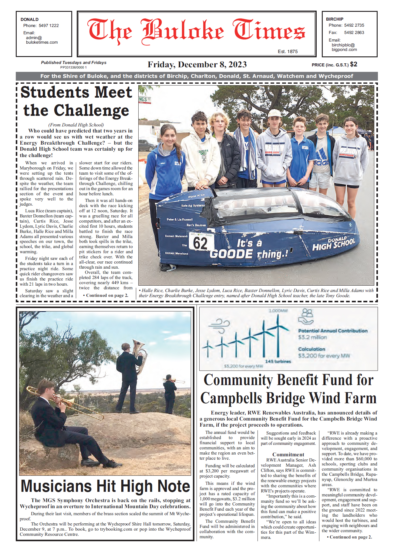 NewsOut now - Archive - December 2023Vic The Buloke Times, 8 December 2023 By The Buloke Times 8 December 2023 Recent stories Stansbury and Port Vincent turn it on for Saltwater Classic Yorke Peninsula Country Times - A better lifestyle through a stronger economy – Queensland back in business as Crisafulli Government unlocks major resources projects: Bleijie Contributor, ARR.News - Armidale event to explore what happens to solar panels at end of life Contributor, ARR.News - Cash is coming back as revealed by RBA survey: NSA Contributor, ARR.News - Global fertiliser market facing prolonged period of strain from Middle East disruption – industry report: Rabobank Contributor, ARR.News - Sheep collagen a wound heal wonder for people: AMPC Contributor, ARR.News - An ANZAC Day remembrance – Pacific Theatre World War 2 Dunoon and District Gazette - Dunoon United Football Club women flying high Dunoon and District Gazette - Making every kilogram of fertiliser count: Australian silicon solution aids farmers amid urea shortage The Editor - Clean water to flow for Narrandera – Coalition commits $16 million to new water treatment plant: Canavan, McCormack, Kovacic, Cooke Contributor, ARR.News - Norco lifts farmgate milk price, warns more support needed for farmers Contributor, ARR.News - It’s almost ANZAC Day, Pete Ramsey New Zealand Veterans Assoc drops in for a chat and James plays a song No Drama Farmer - It isn’t easy being green as solar panels go to waste: Webster Contributor, ARR.News - CLP boosting energy security with large scale batteries for Katherine and Alice Springs: Edgington Contributor, ARR.News - FuelWatch failure exposes Cook Government’s disconnect from regional WA: Hunter Contributor, ARR.News - Load more The Buloke Timeshttps://www.buloketimes.com Out now! Please leave this field emptyKEEP IN TOUCH Sign up for updates from Australian Rural & Regional News Manage your subscription We don’t spam! Read our privacy policy for more info. Thank you for subscribing for updates from Australian Rural & Regional News! By default you will receive all our newsletters. If you'd prefer to choose which newsletters you receive, go to the manage your subscription page make your selection. I'd love to hear from you if you have any feedback on the newsletter or the news platform or the news itself. Best Wishes, Fiona Fox The Editor Share FacebookLinkedinXPinterestWhatsAppEmailReddIt Previous articleTennant & District Times, 8 December 2023Next articleHow’s business? Le Sel, Maldon’s petite French deli For all the news from The Buloke Times, go to https://www.buloketimes.com/ Out Now! Yorke Peninsula Country Times, 21 April 2026 Yorke Peninsula Country Times - Dunoon and District Gazette, April-May 2026 Dunoon and District Gazette - Tarrangower Times, 17 April 2026 Tarrangower Times - Clarence Valley Independent, 17 April 2026 Clarence Valley Independent - Corryong Courier, 16 April 2026 Mark Collins, Corryong Courier - Narrandera Argus, 16 April 2026 Narrandera Argus - On Our Selection News, 16 April 2026 Ted Rogers, On Our Selection News - The Buloke Times, 16 April 2026 The Buloke Times - See all Latest stories from The Buloke Times on ARR.News Environmental surveys continue Contributor, The Buloke Times - 16 April 2026 Farmers’ rights eroded Contributor, The Buloke Times - 16 April 2026 In its 75th year – CFA raises $2.1 million for sick kids The Buloke Times - 9 April 2026 More murals for Donald Contributor, The Buloke Times - 2 April 2026 Birchip silo art reaches finish post The Buloke Times - 26 March 2026 A lifetime of achievements awarded The Buloke Times - 19 March 2026 Art and culture shine at Mali Heart Festival The Buloke Times - 12 March 2026 Ripper rainfall across the region The Buloke Times - 5 March 2026 Load more