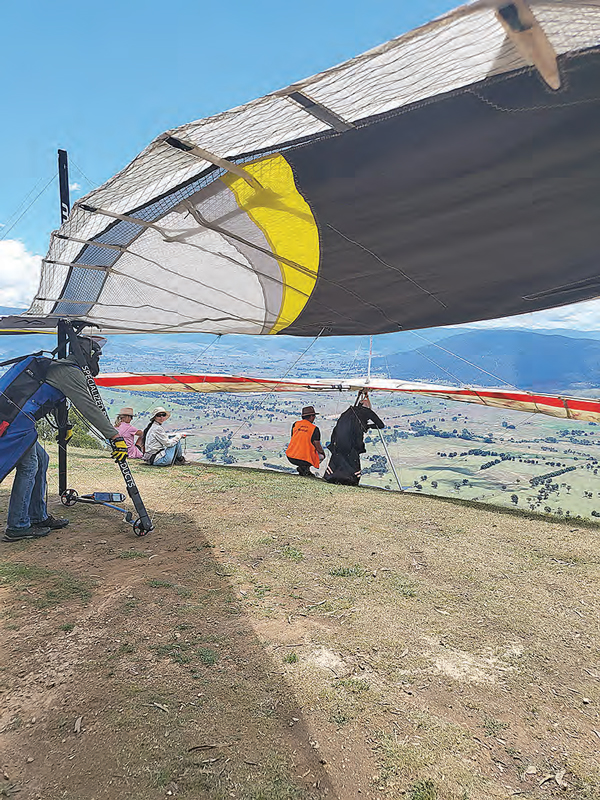 To learn more about the Competitors queue up on the Mt Elliot launch pad. competition you can check out the Corryong Cup Hang Gliding Competition Facebook page or the website www.hgcomps.com.au/corryong.