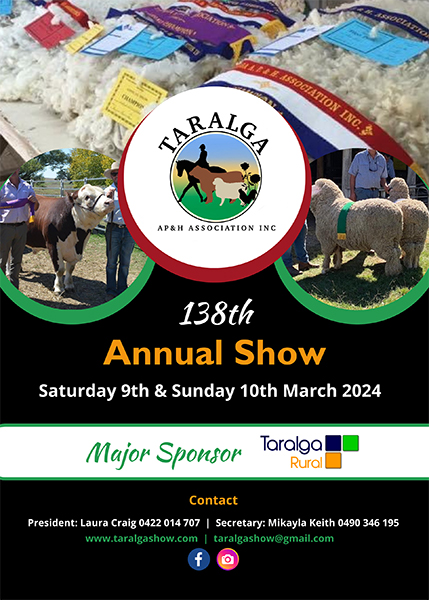AgricultureEventShowsFarmingNewsNSW 138th Taralga Show, 9-10 March 2024 By Contributor, ARR.News 19 February 2024 Recent stories Upcoming webinar – What’s it take to develop offshore wind in Australia? Blue Economy CRC Contributor, ARR.News - Restoration brings Flinders and Freycinet statues back to life Contributor, ARR.News - Delivering free GP appointments for Northern Tasmania: Archer Contributor, ARR.News - Seven Cities to drive next wave of regional economic development: Cook, Dawson Contributor, ARR.News - Territory positions itself at centre of national defence push: Finocchiaro Contributor, ARR.News - SLSNSW distributes publicly accessible shark bite kits to all NSW surf clubs: SLSNSW Contributor, ARR.News - Queensland Dinosaur Week 2026 roars into Hughenden and Flinders Shire Contributor, ARR.News - Banks must dump Environmental, Social and Governance ‘woke’ agenda for coal, gas and oil: McDonald, Canavan, Hogan Contributor, ARR.News - Millie, the BreastScreenNT bus to complete final tour in 2026: NT Health Contributor, ARR.News - When ideology meets the fuel tank Trevor Whittington, CEO WAFarmers - ANZAC Special, plus we get the debrief on Buddy suiting up for Dowerin with Tracy Jones! No Drama Farmer - Editor is Lismore Local Woman of the Year Contributor, indyNR.com - Algal bloom testing results continue positive trend: Malinauskas, Scriven Contributor, ARR.News - Rare native lilies spotted flowering on stock reserve north of Deniliquin Kimberly Grabham, Back Country Bulletin - ANZAC Day a good time to gauge Middle East crisis Erwin Chlanda, Alice Springs News - Load more Contributor, ARR.News Taralga A P & H Association Inc. Please leave this field emptyKEEP IN TOUCH Sign up for updates from Australian Rural & Regional News Manage your subscription We don’t spam! Read our privacy policy for more info. Thank you for subscribing for updates from Australian Rural & Regional News! By default you will receive all our newsletters. If you'd prefer to choose which newsletters you receive, go to the manage your subscription page make your selection. I'd love to hear from you if you have any feedback on the newsletter or the news platform or the news itself. Best Wishes, Fiona Fox The Editor Share FacebookLinkedinXPinterestWhatsAppEmailReddIt Previous articleThe rise of insecticide resistance in the redlegged earth mite: AgriFutures AustraliaNext article86th Comboyne Show, 2-3 March 2024 Out Now! Tarrangower Times, 24 April 2026 Tarrangower Times - Clarence Valley Independent, 24 April 2026 Clarence Valley Independent - On Our Selection News, 23 April 2026 Ted Rogers, On Our Selection News - Allora Advertiser, 22 April 2026 Mim Rogers, Allora Advertiser - The Buloke Times, 23 April 2026 The Buloke Times - Narrandera Argus, 23 April 2026 Narrandera Argus - Denmark Bulletin, 23 April 2026 Denmark Bulletin - Corryong Courier, 23 April 2026 Mark Collins, Corryong Courier - See all