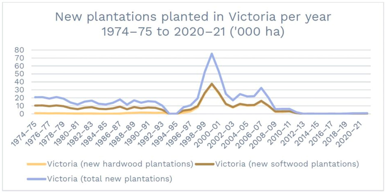 Subsequently, native forest hardwood sawlog production declined and has not been balanced by increased plantation sawlog production. Since 2019, there has been a reduction of 50,000 hectares of plantations and a 30 per cent reduction in log supply from forests and plantations. The total log supply from native forests, hardwood, and softwood plantations has declined by three million cubic metres annually.