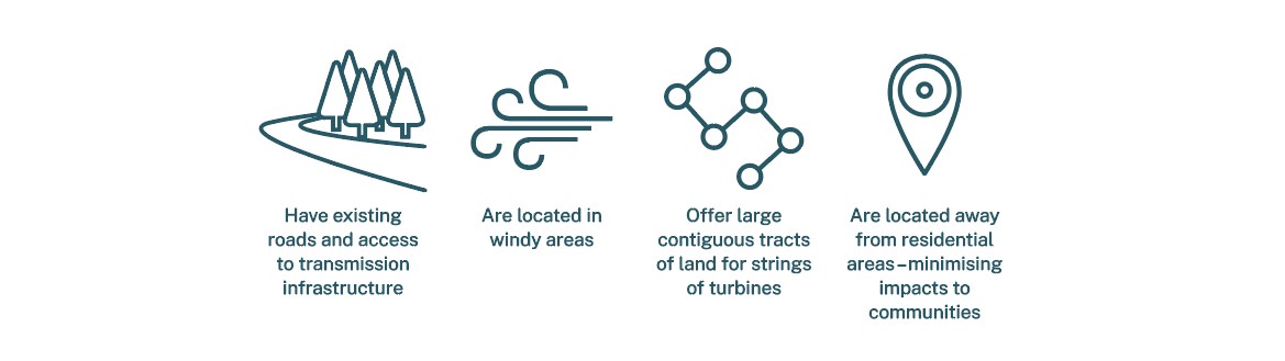 The pine plantation sites have been considered for wind turbine projects because these state forests have existing infrastructure in place, such as roads and powerlines, and are often located some distance from neighbouring residential estates. Native forests are not included in these project areas.
