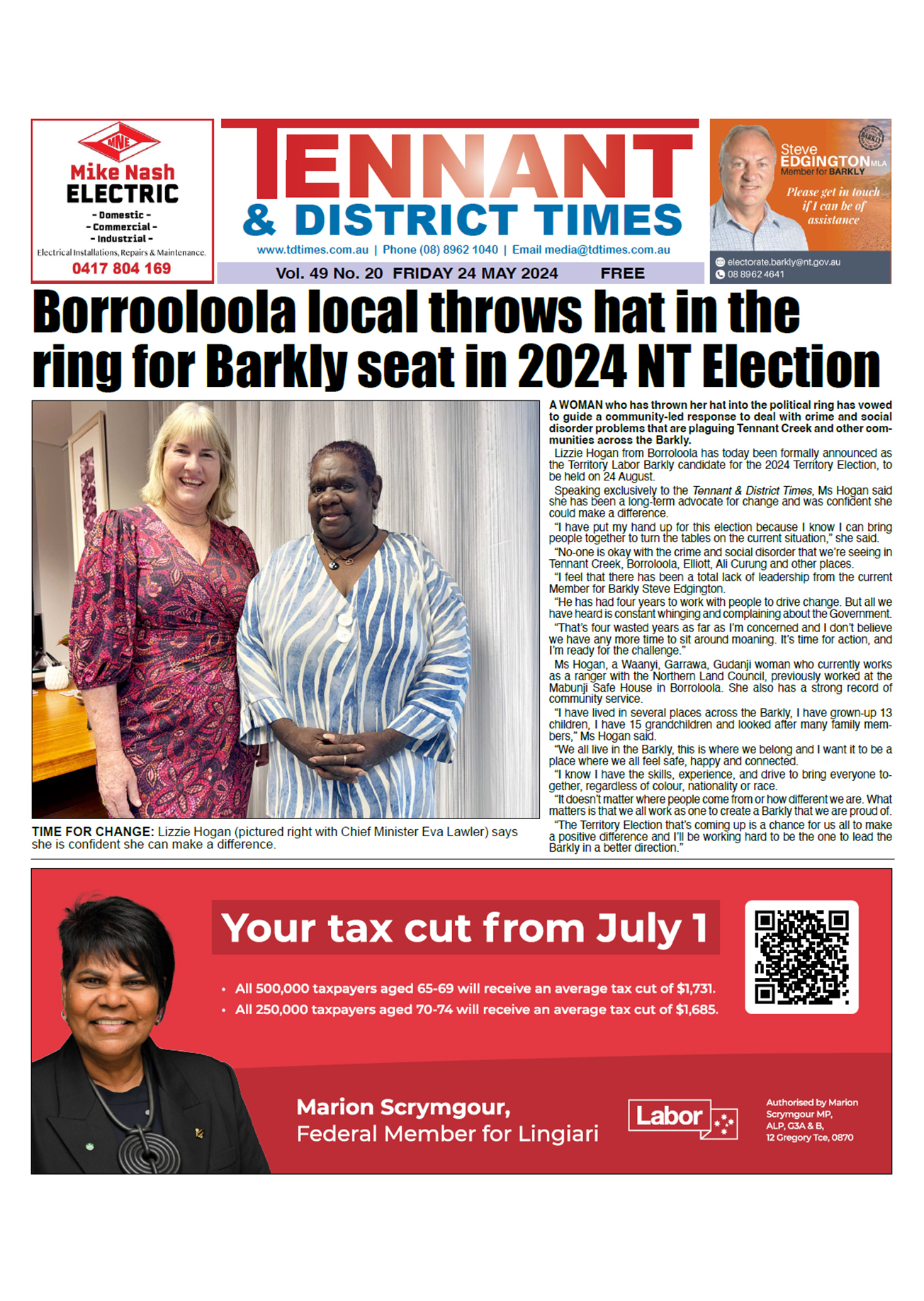 NewsNTOut now - Archive - May 2024 Tennant & District Times, 24 May 2024 By Tash Adams, Tennant & District Times 24 May 2024 Recent stories Right royal award for a guinea pig lover Coast Community News - Labor Government must act on wine crisis to help fuel crisis: Canavan, Chester Contributor, ARR.News - Renewables lift supply share as batteries re-shape energy markets: AEMO Contributor, ARR.News - Westbrook ANZAC service still growing Ted Rogers, On Our Selection News - Strong turnout for ANZAC Day Coast Community News - Reflection and remembrance on the Mount The Buloke Times - Cadets honoured with memorial role Mark Collins, Corryong Courier - Our fallen will never be forgotten Mark Collins, Corryong Courier - River Country Art Trail unveiled Contributor, The Koondrook and Barham Bridge Newspaper - Faster environmental approvals with states and territories: Albanese, Watt Contributor, ARR.News - Rabobank commentary: food price inflation remains entrenched above three per cent Contributor, ARR.News - Students gain insight into engineering careers Narrandera Argus - Epic Fury and Ukrainian farmers: Who will win? Pavel Kuliuk, ARR.News - Farmland prices set for continued “modest” growth in year ahead – Rabobank Contributor, ARR.News - Agricultural industry bodies seek amendments to proposed legislative reform to maintain protections for Condamine Alluvium groundwater system critical for farmers and rural communities: QFF Contributor, ARR.News - Load more Tash Adams, Tennant & District Timeshttps://www.tdtimes.com.au/ Out now! Available here! Please leave this field emptyKEEP IN TOUCH Sign up for updates from Australian Rural & Regional News Manage your subscription We don’t spam! Read our privacy policy for more info. Thank you for subscribing for updates from Australian Rural & Regional News! By default you will receive all our newsletters. If you'd prefer to choose which newsletters you receive, go to the manage your subscription page make your selection. I'd love to hear from you if you have any feedback on the newsletter or the news platform or the news itself. Best Wishes, Fiona Fox The Editor Share FacebookLinkedinXPinterestWhatsAppEmailReddIt Previous articleTarrangower Times, 24 May 2024Next articleThe Buloke Times, 24 May 2024 For all the news from the Tennant & District Times, go to https://www.tdtimes.com.au/ Out Now! The Buloke Times, 30 April 2026 The Buloke Times - On Our Selection News, 30 April 2026 Ted Rogers, On Our Selection News - Narrandera Argus, 30 April 2026 Narrandera Argus - Corryong Courier, 30 April 2026 Mark Collins, Corryong Courier - Coast Community News, 30 April 2026 Coast Community News - The Koondrook and Barham Bridge Newspaper, 30 April 2026 Lloyd Polkinghorne, The Koondrook and Barham Bridge Newspaper - Allora Advertiser, 29 April 2026 Mim Rogers, Allora Advertiser - Yorke Peninsula Country Times, 28 April 2026 Yorke Peninsula Country Times - See all Latest stories from the Tennant & District Times on ARR.News Early voting begins for NT election Tash Adams, Tennant & District Times - 16 August 2024 Desert Harmony Festival: A weekend of festivities and music Tash Adams, Tennant & District Times - 9 August 2024 Remembering Elliot McAdam: Local leader honoured for service to Barkly Tash Adams, Tennant & District Times - 9 August 2024 Services collaborate to address community legal needs in Barkly Tash Adams, Tennant & District Times - 9 August 2024 Writ issued: Countdown on for NT election Tash Adams, Tennant & District Times - 2 August 2024 New homes ready for tenants, tender awarded for 6 more Tash Adams, Tennant & District Times - 2 August 2024 New social and affordable homes for Tennant Creek Tash Adams, Tennant & District Times - 26 July 2024 Culturally significant objects returned home to Warumungu country Tash Adams, Tennant & District Times - 26 July 2024 Load more