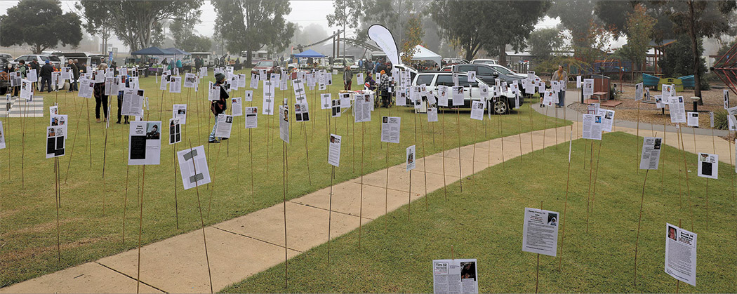 600 bamboo stakes stood amongst the crowd at the Kerang Community Market on Saturday. Each stake held the story of an Australian who had an adverse reaction to the mandated Covid-19 therapeutic. These individuals had their cases listed on the TGA website and wanted their story told, or in the cases of those who died, a story their family shares.