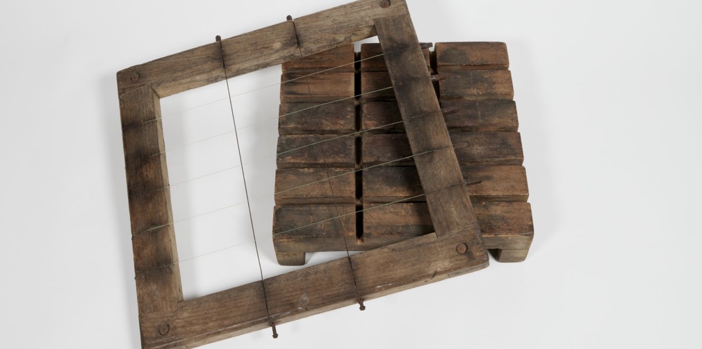 But when the factories began producing butter in commercial quantities, they began producing a standard size. A simple device made from wood and wire, a butter cutter cut a 9-pound slab (just over 4 kilograms) of butter into more manageable and saleable half-pound (just over 225 grams) blocks. Each half-pound block was wrapped in parchment paper for transport and sale.