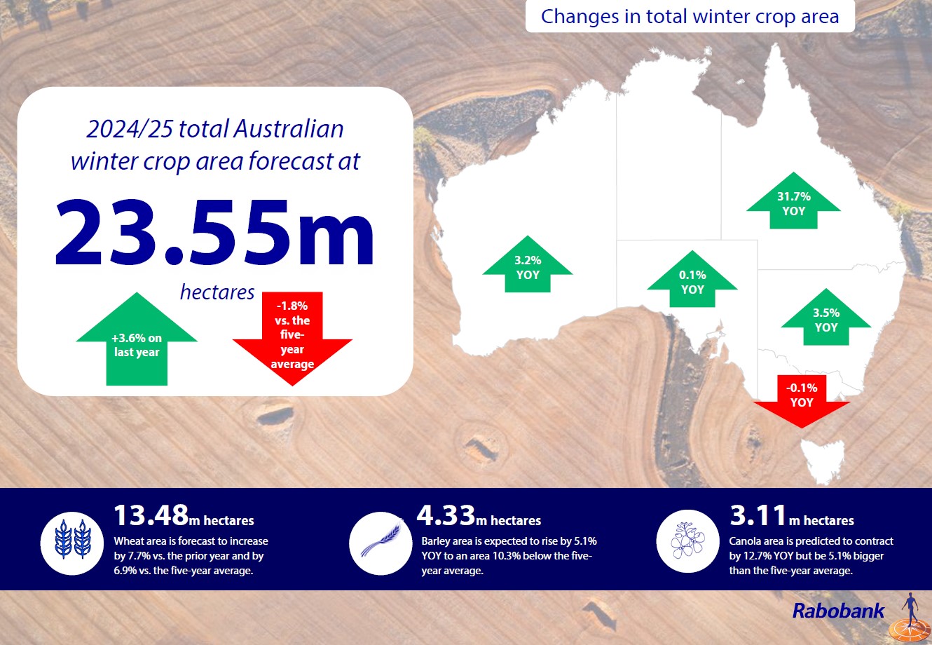 Australia’s farmers are expected to plant 23.55 million hectares to winter crops this year – up more than three per cent on 2023 – despite a mixed start to the season across the country, Rabobank says in its 2024/25 Australian Winter Crop Outlook.