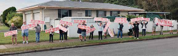 When the bus entered Carrs Drive it was greeted by more than 40 people on both sides of the road waving “Stop the Fill” and other protest signs.