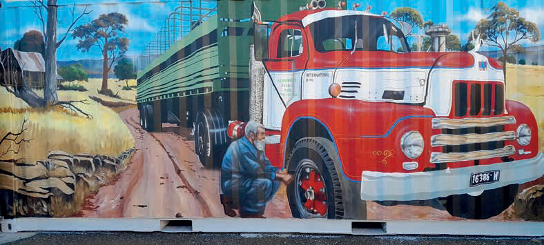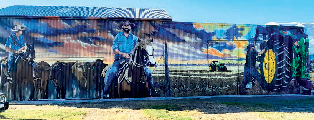 Businessman Eric Liljegren of Condamine Seeds and Tyres organised Malcolm and Kerry to paint a mural based on his business but also to reflect on the rural community and district of Condamine.