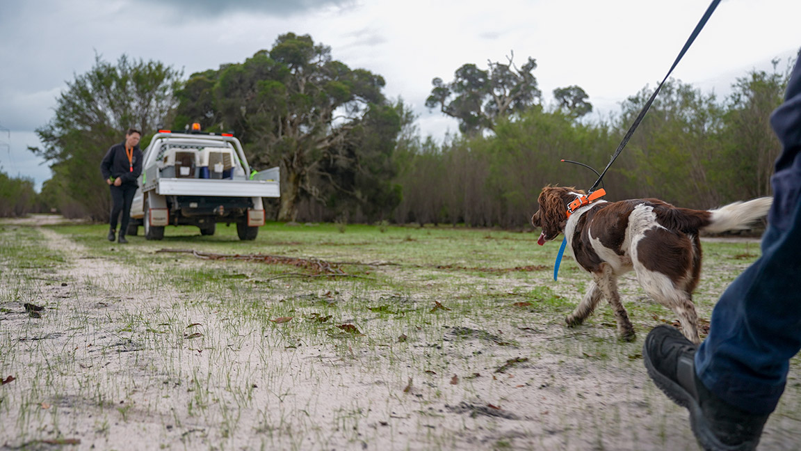 DBCA’s Ecosystem Health Branch has brought two scent-detection dogs over from NSW for a week-long trial testing their abilities in the lab and in the field in WA.