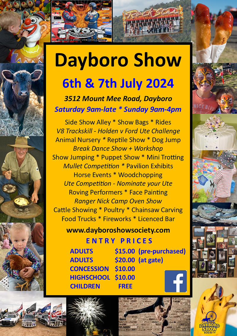 - The Dayboro Show will be held on Saturday 6th July 9am – late, Sunday 7th July 9am – 4pm and the Championship Dog Show is on Friday 5th July (free entry on Friday)