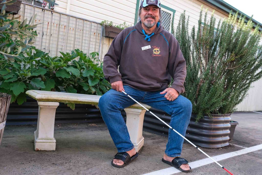 He has a badge from Vision Australia that says I have low vision and if he needs to he has a white cane known as an ID cane that is used to alert others to Steve’s low vision.