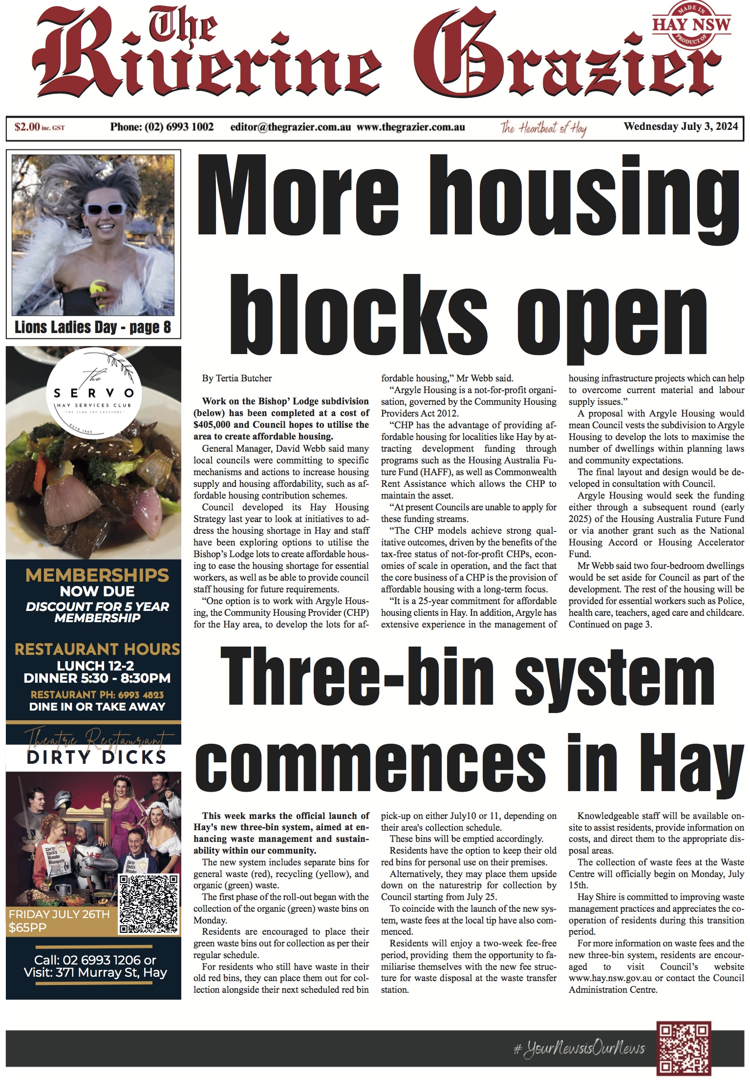 NewsNSWOut now - Archive - July 2024 The Riverine Grazier, 3 July 2024 By Krista Schade, The Riverine Grazier 3 July 2024 Recent stories Radical Right v Radical Left and the threat of the Age of Unreason Kookaburra, ARR.News - Renewed effort to supercharge faba bean breeding and expansion: GRDC Contributor, ARR.News - Elders bales on WA wool growers – Just the tip of the iceberg: Geoff Pearson WAFarmers Contributor, ARR.News - SA standing up for the River Murray – does One Nation?: Bourke Contributor, ARR.News - New Regional University Study Hub opens in Tumut: Clare, McBain Contributor, ARR.News - Council continues targeted engagement ahead of Murray-Darling Basin Plan review Contributor, ARR.News - Low – interest drought loans open with a warning for growers Murray Pioneer - Naracoorte’s rising star Nasik Swami, Naracoorte Community News - Grandstand opening Emily Gladdis, Nhill Free Press & Kaniva Times - Dinawan Solar Farm approved despite strong objections Tertia Butcher, The Riverine Grazier - RACGP leaders head to regional Victoria Contributor, ARR.News - New machine improves soil fertility and increases crop yields Greg Hamilton, ARR.News Sponsor - Diesel stockpile for WA – announcement and response Contributor, ARR.News - Algal bloom on the move Yorke Peninsula Country Times - Italian for a day or for 145 years at New Italy celebrations Contributor, indyNR.com - Load more Krista Schade, The Riverine Grazierhttps://www.thegrazier.com.au Out now! Subscribe here! Please leave this field emptyKEEP IN TOUCH Sign up for updates from Australian Rural & Regional News Manage your subscription We don’t spam! Read our privacy policy for more info. Thank you for subscribing for updates from Australian Rural & Regional News! By default you will receive all our newsletters. If you'd prefer to choose which newsletters you receive, go to the manage your subscription page make your selection. I'd love to hear from you if you have any feedback on the newsletter or the news platform or the news itself. Best Wishes, Fiona Fox The Editor Share FacebookLinkedinXPinterestWhatsAppEmailReddIt Previous articleClarence Valley Independent, 3 July 2024Next articleNhill Free Press & Kaniva Times, 3 July 2024 For all the news from The Riverine Grazier, go to https://www.thegrazier.com.au Out Now! Corryong Courier, 16 April 2026 Mark Collins, Corryong Courier - Narrandera Argus, 16 April 2026 Narrandera Argus - On Our Selection News, 16 April 2026 Ted Rogers, On Our Selection News - The Buloke Times, 16 April 2026 The Buloke Times - Coast Community News, 16 April 2026 Coast Community News - The Koondrook and Barham Bridge Newspaper, 16 April 2026 Lloyd Polkinghorne, The Koondrook and Barham Bridge Newspaper - Allora Advertiser, 15 April 2026 Mim Rogers, Allora Advertiser - Murray Pioneer, 15 April 2026 Murray Pioneer - See all Latest stories from The Riverine Grazier on ARR.News Dinawan Solar Farm approved despite strong objections Tertia Butcher, The Riverine Grazier - 15 April 2026 ‘A piece of paper in the wind’ – Part One of shining a light on Hay’s homelessness issue Kimberly Grabham, The Riverine Grazier - 8 April 2026 Council prepares to launch 10-year plan, reflecting economic transition Tertia Butcher, The Riverine Grazier - 1 April 2026 I am not a Harvard graduate – One Nation candidate David Farley Kimberly Grabham, The Riverine Grazier - 25 March 2026 Building an empire, one agri opportunity at a time Tertia Butcher, The Riverine Grazier - 18 March 2026 Tiny homes project changing lives of young students Kimberly Grabham, The Riverine Grazier - 11 March 2026 The stink about releasing the carp virus Krista Schade, The Riverine Grazier - 4 March 2026 EnergyCo needs a shake-up Tertia Butcher, The Riverine Grazier - 25 February 2026 Load more