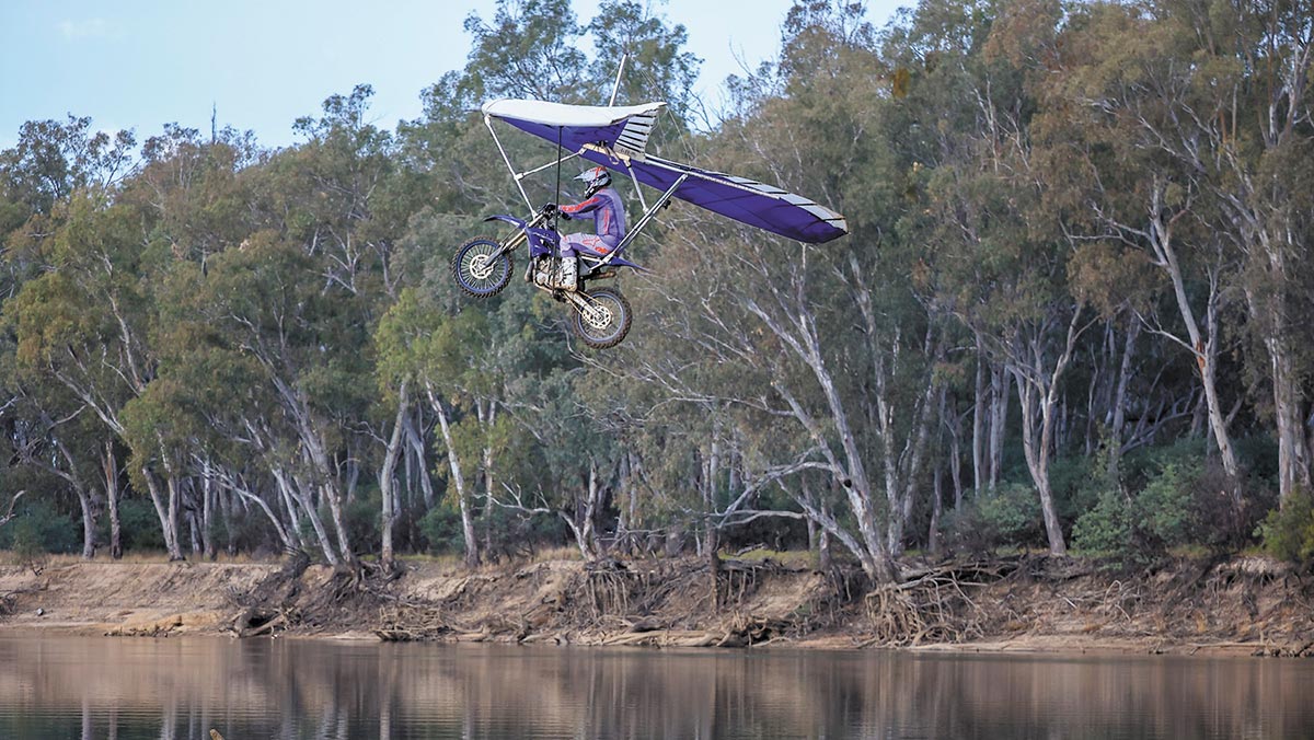 When a video of Bob Correll, an American daredevil famous for his long-distance jumps on his infamous kite cycle popped up on Kale’s phone, a flight across the Murray became his next challenge. Having already made a splash in October 2023 when the motorcycling enthusiast rode his Yamaha YZ across the Murray River “full noise” across Australia’s most iconic river, the former Koondrook resident turned to a Ballarat-based hang-gliding champion, Rowan Holtcamp, for guidance.