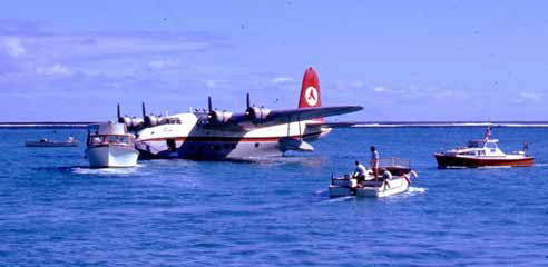 Circling down, we made a low pass over the lagoon. It was a shock to see the white coral bottom as clearly as if there was no water at all and at first I thought there must be some mistake in the tidal information we had been given. We checked with the Island again. No, it was only just past high tide and there would be about 10 feet of water in the lagoon. Despite this assurance, it was an uncomfortable feeling to be alighting on water that appeared to be only a few inches deep and, as we were finishing our run towards the two towering mountains at the southern end, I waited in some trepidation to see what would happen when the aircraft came off the step and settled into the water. To my relief all appeared to be well and I turned back towards a boat putting out from the shore.