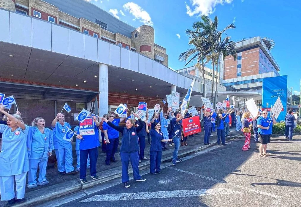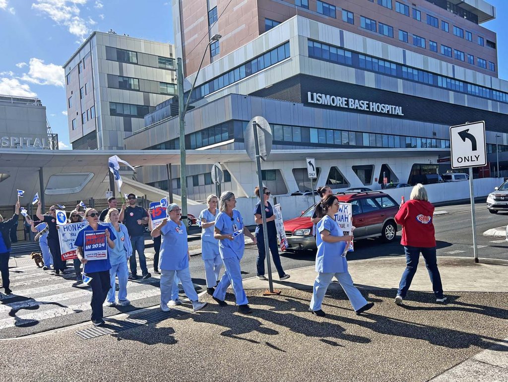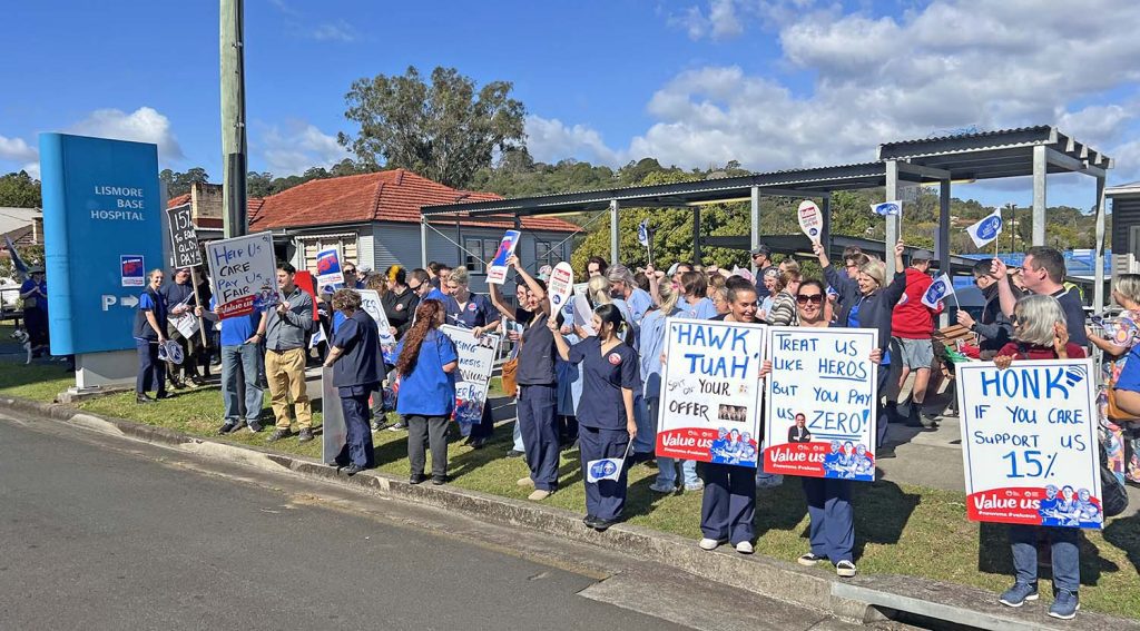 Cars didn’t stop tooting as they drove slowly by the nurses, midwives and other hospital staff protesting outside Lismore Base Hospital today, Tuesday, July 30.