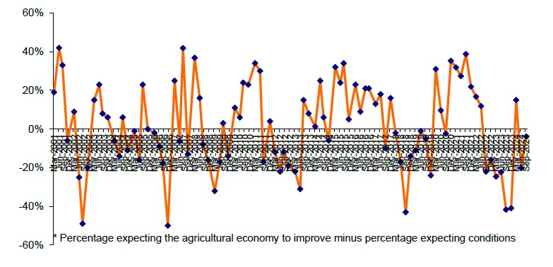 The Q3 survey, completed last month, found those Australian farmers expecting the agricultural economy to improve in the coming 12 months had increased to 23 per cent (from 15 per cent with that view in the previous quarter). And fewer respondents (27 per cent) were now expecting conditions to worsen (down from 36 per cent).