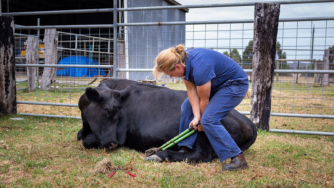 Lisa’s been a vet for 25 years now and has certainly had her share of injuries but thankfully nothing serious. And don’t be fooled by Lisa’s slight frame; this woman is incredibly strong. Strength is definitely needed when using equipment such as giant hoof trimmers to undertake the less-than-glamorous task of clipping hooves that have grown too long. She’s also been known to use an angle grinder for this type of bovine-pedicure.
