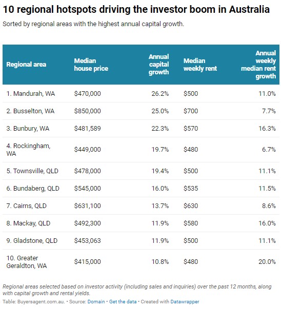 Buyers Agent has identified 10 regional hotspots to watch, based on investor activity (including sales and inquiries) over the past 12 months, along with capital growth and rental yields.