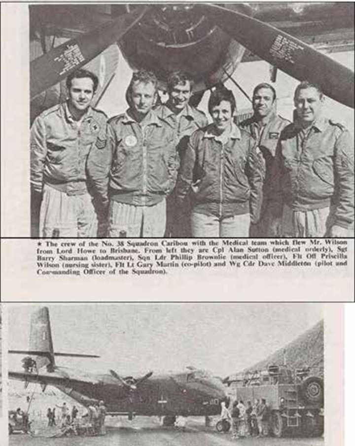 The first aircraft to land on the airstrip was a RAAF Caribou, which flew in atrocious weather in order to evacuate Wally Wilson, whose leg was pinned under a falling tree following a chainsaw accident. All the Island residents were there to watch the first landing.