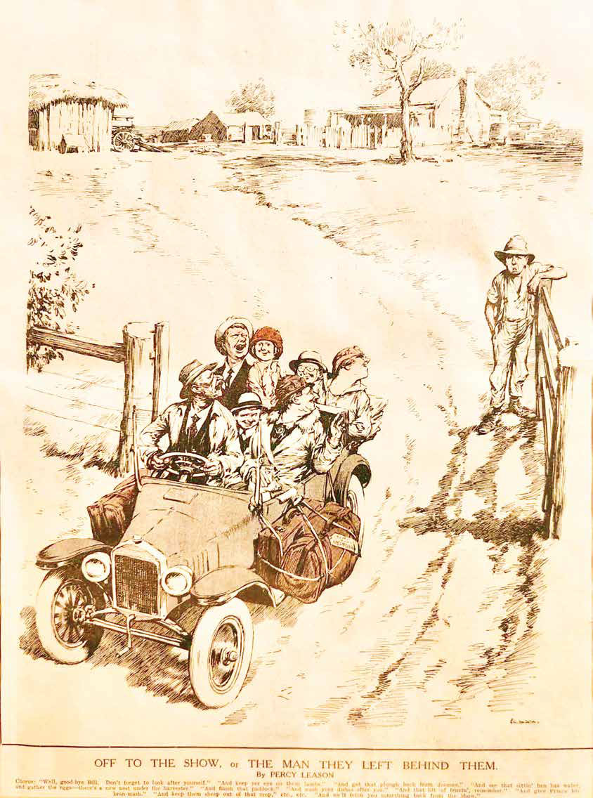 Percy Leason’s iconic cartoon ‘Off to the Show, or The Man They Left Behind Them’ graces the cover of this year’s Kaniva Show schedule. To coincide with the Wiregrass project, Kaniva and District Progress Association will showcase a small temporary exhibition of several of Leason’s never-before-seen cartoons, highlighting various aspects of agricultural shows.