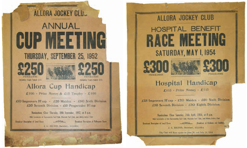 With the move into new premises from the old Clifton Courier building staff unearthed historic articles such as these large Allora Jockey Club posters. Glued to the wall and partly covered by a timber beam, these two posters (glued back to back) are of great interest to Allora. Other items found were Allora Jockey Club Race Books from 1935.