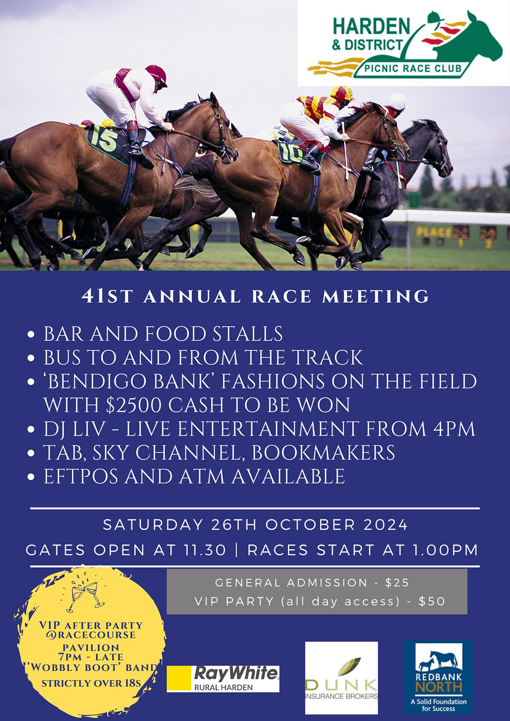 At 4pm DJ Liv will get race goers pumped for the VIP After Party which kicks off at 7pm inside the Pavilion. This year popular band ‘Wobbly Boot’ will entertain the sell out crowd to ensure the race day is one not to be forgotten!