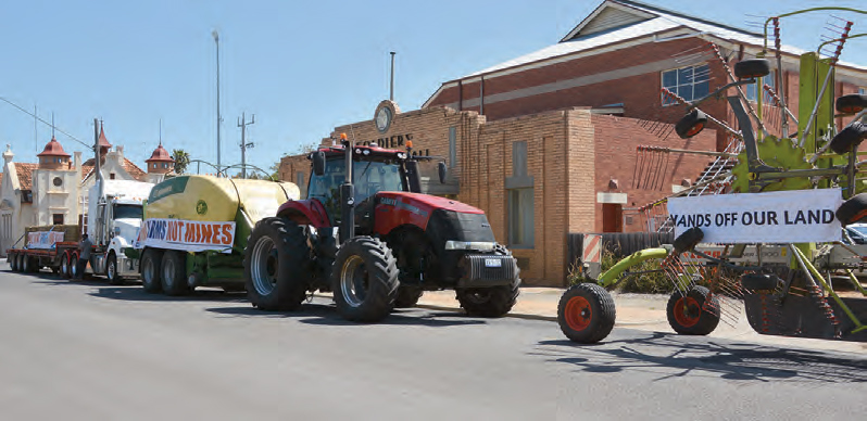 Emotions ran high and voices rose with them at the Donald Mineral Sands community information session held at the Memorial Hall on Thursday, with a group of frustrated farmers taking the opportunity to protest one of the many large scale projects earmarked for the region. Trucks, tractors and other agricultural machinery lined the streets, signed with phrases such as: “No Mines, No Turbines, No Transmission Lines!”