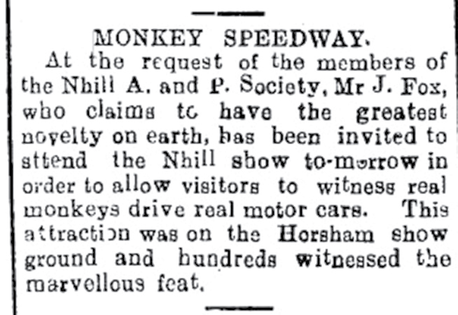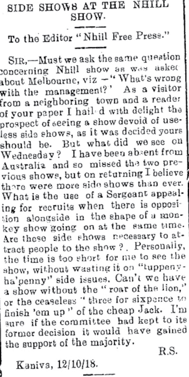 Footnote: Below a crotchety Kaniva character vents his spleen in a letter to the editor of the Nhill Free Press over a monkey side show in 1918. There was a record attendance that year.