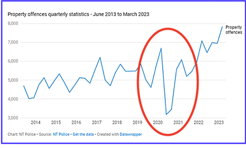The near doubling of Jobseeker Payments during Covid saw millions of people relieved from poverty around the country, and a positive social impact including a dramatic reduction in property crime in the Northern Territory (where residents were not subject to lockdowns) to the lowest in a decade (see graph).